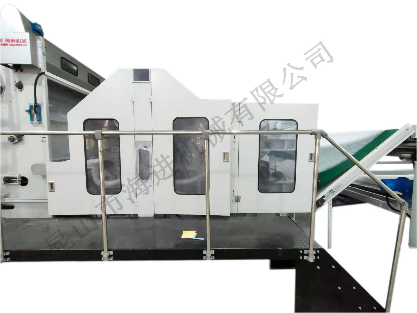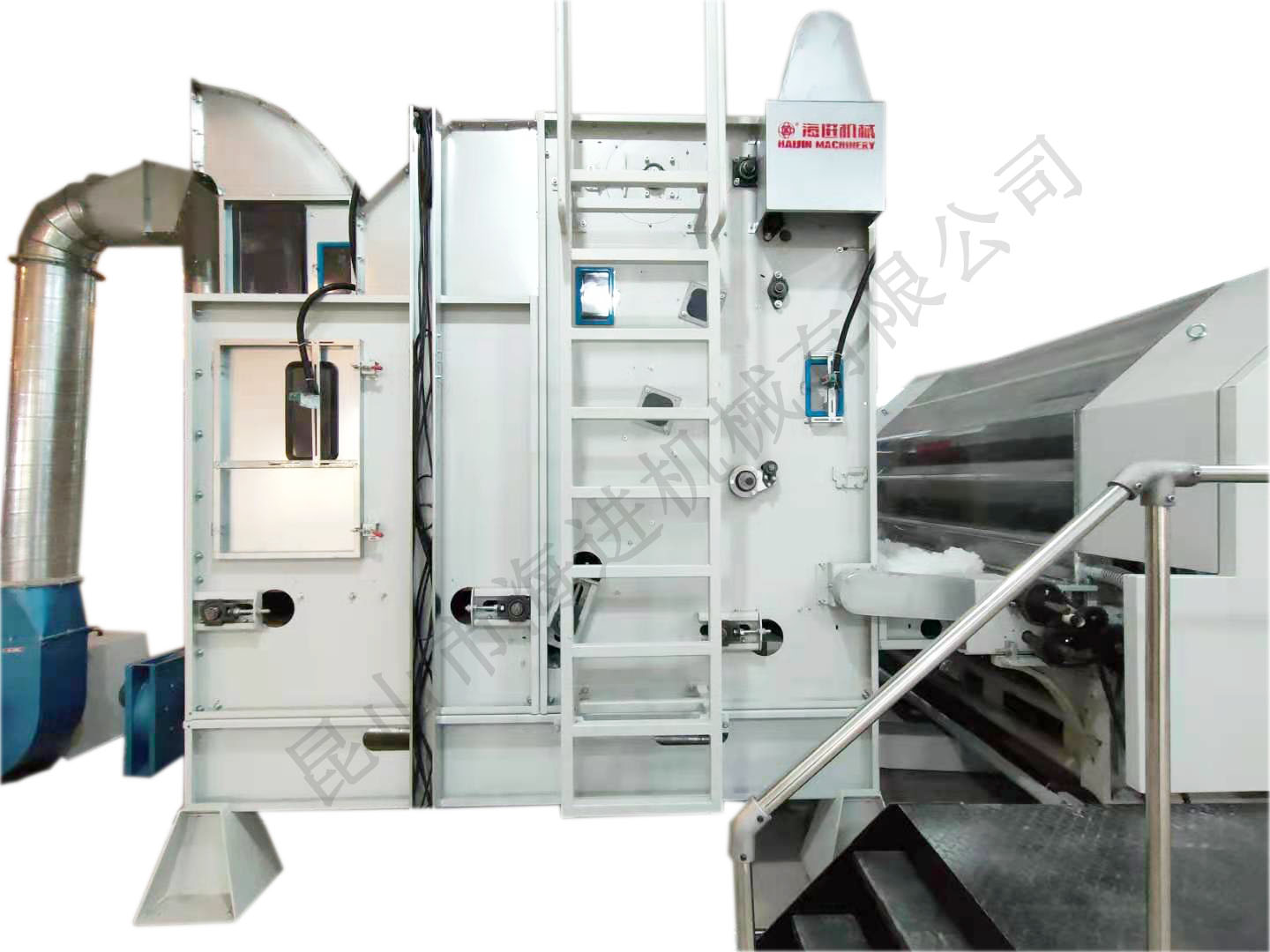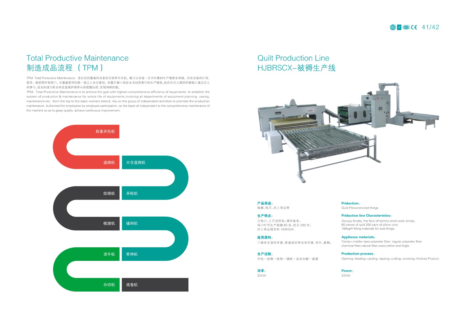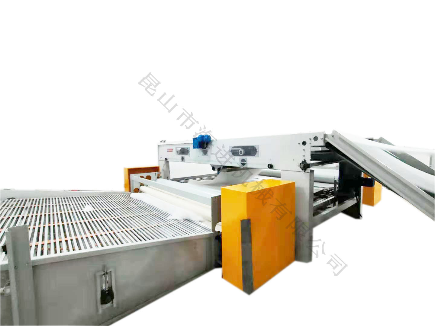 本生產線專為化纖填充被套的自動化生產設計,涵蓋從纖維梳理、填充物鋪網到被套封裝的全流程,具有高效、精準、衛生等特點,適用于家紡、酒店用品、醫療寢具等領域的大規模生產。 化纖原料預處理 原料開松:將壓縮的化纖塊(如滌綸、PP棉等)通過開松機打散,形成蓬松狀態。 纖維梳理:通過高速梳理機將纖維梳理成均勻的網狀結構,確保填充物無結塊、厚度一致。 填充物鋪網與定型 交叉鋪網機將梳理后的纖維多層疊加,調節克重和蓬松度。 短程熱風定型(可選):通過低溫熱風穩定纖維結構,增強回彈性。 被套裝配與封裝 自動裁切:按預設尺寸切割填充層,匹配被套外殼。 充填裝套:通過充填機將纖維層均勻填入預制的被套外殼,避免分布不均。 絎縫/封口:采用多針絎縫機固定填充物,或通過超聲波封口機完成密封(防螨抗菌需求場景)。 質檢與包裝 重量檢測:確保每床被子填充量符合標準。 金屬探測:排除生產過程中可能的金屬雜質。 自動折疊包裝:真空壓縮(可選)后裝箱。 高效率:全自動化流程,日產量可達2000~5000床(視規格而定)。 精準控制:PLC系統調節填充量、絎縫間距等參數,誤差≤2%。 衛生環保:封閉式填充環節減少粉塵污染,支持可回收化纖材料。 靈活適配:可快速切換不同被套尺寸(單人/雙人/加大)和填充克重。 智能分揀系統:聯動MES系統實現訂單批次管理。 抗菌處理模塊:在線噴涂抗菌劑(適用于醫療、兒童用品)。生產線概述